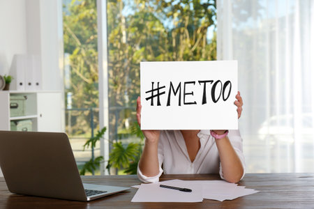 Woman holding paper with text #METOO in office. Problem of sexual harassment at work