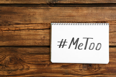 Hashtag METOO in notebook on wooden background, top view with space for text. Stop sexual assault