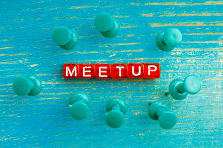pushpins stuck into a wooden surface near the word meetup. meeting of associates