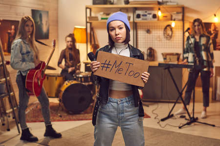 Young woman holding sign with metoo hashtag text. Sexual abuse, equal gender right.