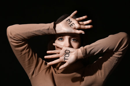 Scared young woman with text ME TOO written on her palms against dark background. concept of harassment