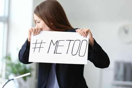 Young woman holding paper with hashtag MeToo in office. concept of harassment
