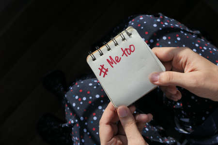 Me Too Harassment Campaign. Portrait of young woman holding a note with the text me too in social movement stop sexual abuse women human rights concept isolated on black background.