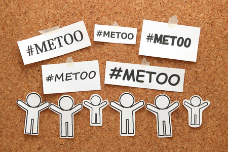 Me Too hashtag word on white papers and people on bulletin board. Me Too social movement hashtag against sexual assault and harassment.