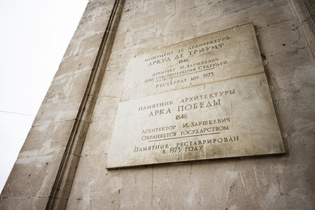 Chisinau, Moldova - November 22, 2025: A close view of Triumphal Arch commemorative stone plaque on a stone wall in Chisinau Moldova.