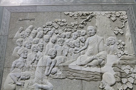 Elaborate wall decoration showing Buddhism Virtues in Sampov Pram Pagoda atop Preah Monivong National Park in Kampot, Cambodia