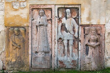 The ancient St. George's Cathedral. A fragment of the wall of an Orthodox church of the XIII century with carved decorations. Yuryev-Polsky, Russia, 2022
