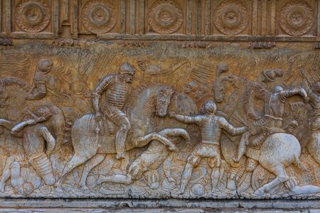 Granada, Spain – 2019. Beautiful relief wall sculpture depicting the soldiers fighting on horseback on the ancient wall of Alhambra Palace.