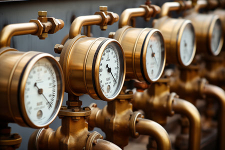 Close-up view of industrial gauges and pipes, showcasing precision instruments for measuring and monitoring pressure in a factory environment.