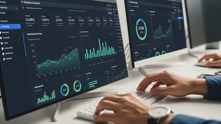 Hands typing on a keyboard with an enterprise analytics dashboard displaying charts and data on computer monitors.