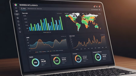 Close-up of a laptop screen displaying a business analytics dashboard, with data and charts.