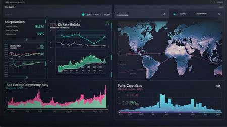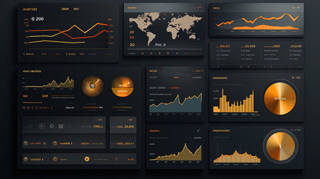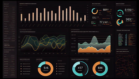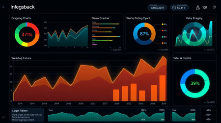 A modern digital interface featuring various data visualizations and graphs designed for analytics and monitoring, set against a dark background.