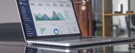 Laptop displaying graphs and charts sits on a desk, reflecting the surrounding office environment
