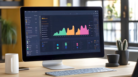 Modern computer monitor on a wooden desk displaying business analytics with colorful graphs and charts in a stylish office setting