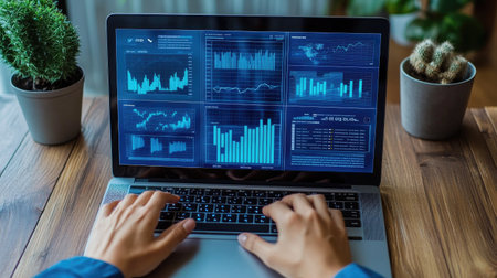 A focused business analyst types on a laptop while analyzing financial data and charts. The workspace features modern design elements and greenery.