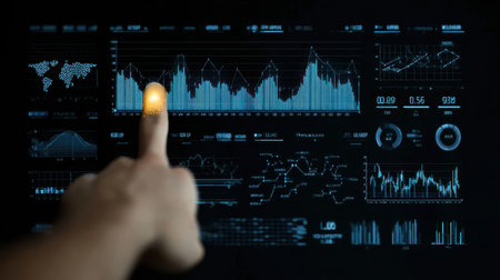 Interactive Data Visualization on a Touchscreen Display Showing Statistical Graphs and Analytics with a Hand Gesture for Modern Technology Concepts