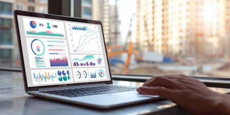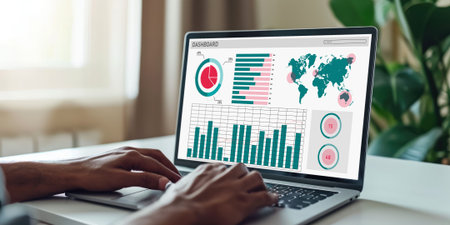 Close-up of a laptop screen with a dashboard displaying various graphs and charts, highlighting data visualization