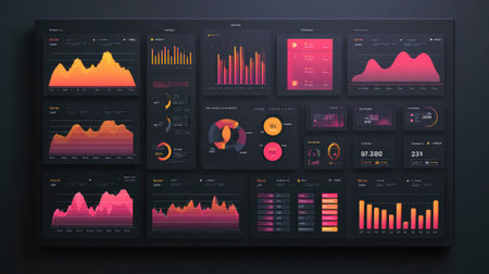 Vibrant and modern data visualization dashboard showcasing various graphs and metrics, perfect for illustrating analytics, technology, and digital solutions in professional contexts.