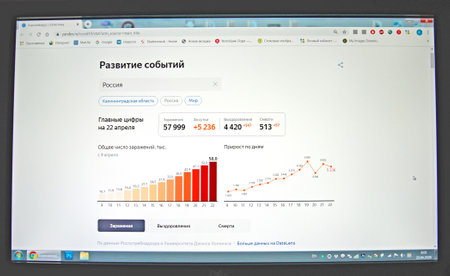 RUSSIA - APRIL 23, 2020: Page of the site with a chart of the incidence of coronavirus on the monitor screen. The epidemic of coronavirus COVID-19 in Russia. Russian text