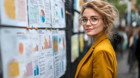 A confident businesswoman delivers a captivating project presentation using precise visuals and vibrant tones Charts and graphs highlight strategic planning and data-driven insights Her bright yellow blazer symbolizes optimism and creativity, creating a powerful impact This image is perfect for presentations, articles, websites, and other business materials, conveying progress and AI Generative