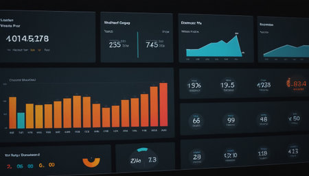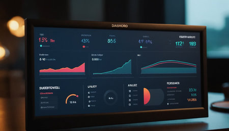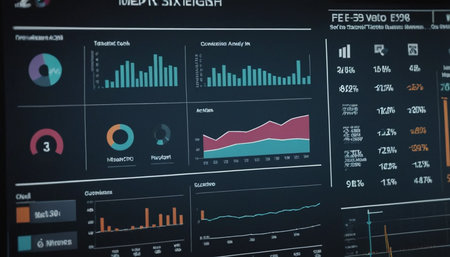 A focused shot of a large screen featuring realtime data visualization tools showcasing interactive segments filled with KPIs and metrics. The screen highlights areas of performanc