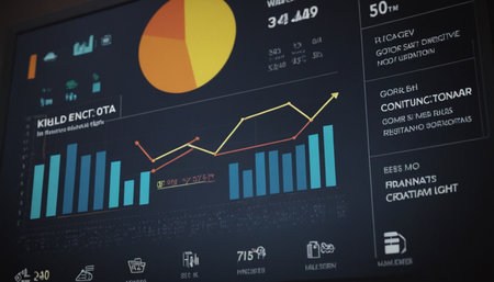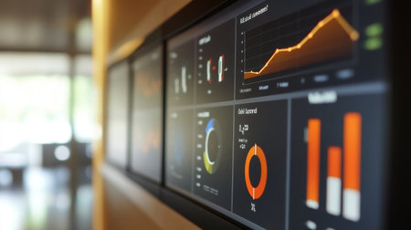 Modern data visualization displayed on a large screen showcases graphs and charts reflecting financial performance metrics in a contemporary office setting.