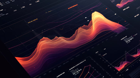 Overlapping, translucent area charts in gradient hues on a dark background, creating an elegant, data-rich visual effect
