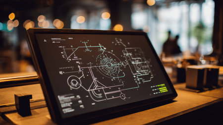 A close-up view of a tablet displaying an intricate technical blueprint in a contemporary workspace. The environment features warm lighting, highlighting innovation and design.