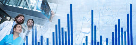 Doctors looking at x-ray radio in hospital with data and graphics concept background. digitally generated
