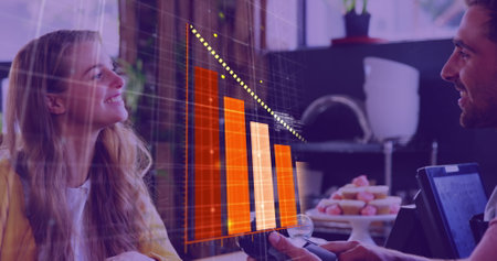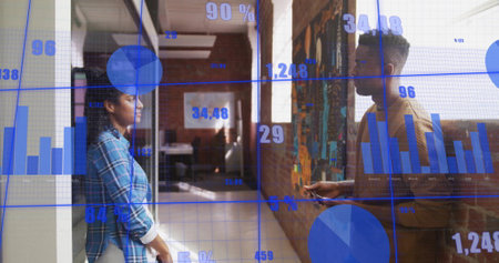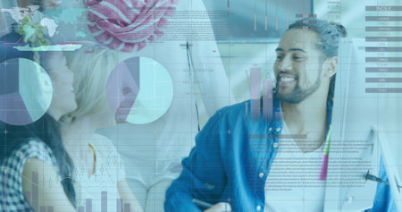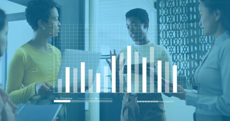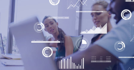 Image of data processing and diagrams over diverse colleagues discussing work. Business and digital interface concept digitally generated image.