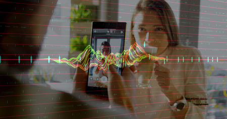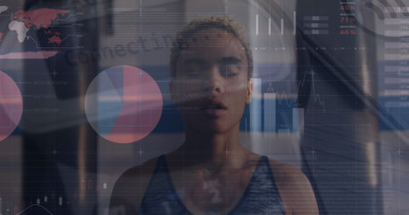 Image of infographic interface, biracial female woman closing eyes and taking deep breath. Digital composite, multiple exposure, equipment, report, business, global and technology concept.