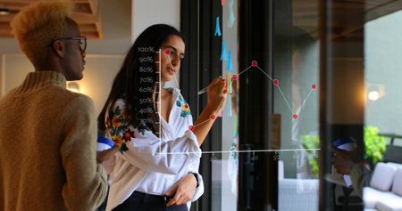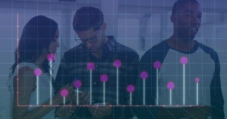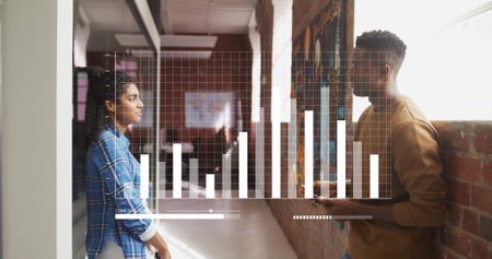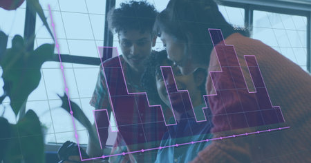 Reviewing professionals wearing business attire viewing bar chart overlay in office with smartphone. Collaboration, technology, data, innovation, teamwork, modernity, analytics