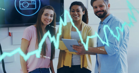Image of blue lines and data processing over diverse business people in office. Global business, finances, computing and data processing concept digitally generated image.