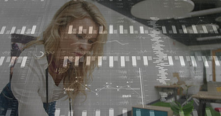 Analyzing data image over businesswoman working with transparent screen in office. Technology, innovation, data analysis, future, digital, modern