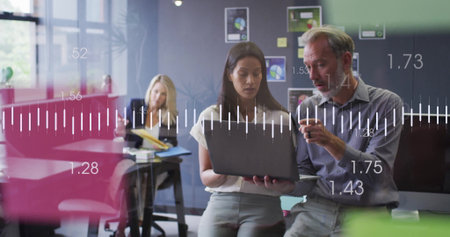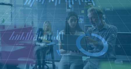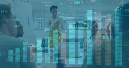 Image of financial data processing over diverse business people in office. Global finance, business, connections, computing and data processing concept digitally generated image
