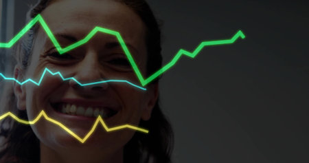 Displaying woman wearing dark top smiling on left in office, with green, blue, yellow trend lines. Business, analytics, technology, data, finance, professional, innovation