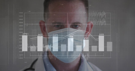 Image of statistics and data processing over male doctor. global medicine, healthcare services, digital interface and technology concept digitally generated image.