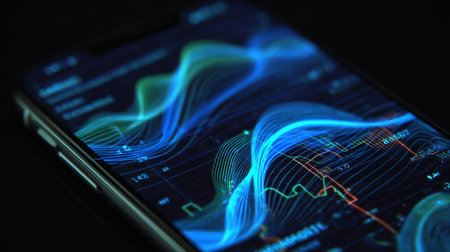 A close-up of a smartphone screen showing a financial app with graphs tracking investment performance and market trends.