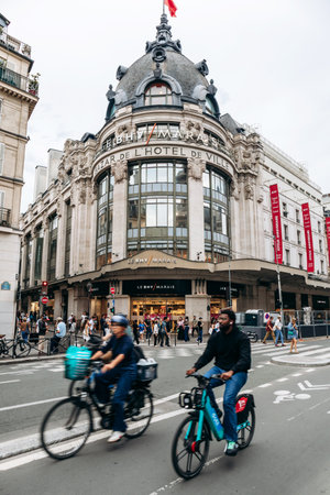 Paris, France - September 7, 2025: Le BHV Marais department store facade on Rue de Rivoli with cyclists and pedestrians.