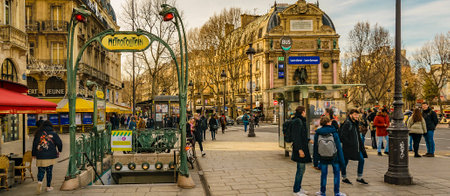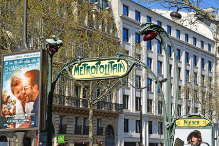 PARIS, FRANCE - OCTOBER 9, 2014: Picture here is a Metro subway entrance street scene in Paris, France with many people visible.