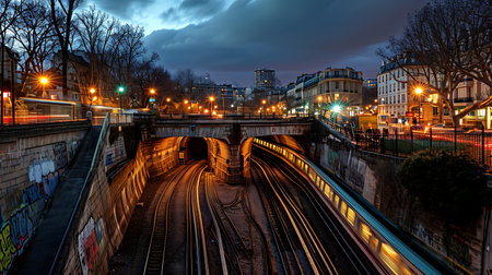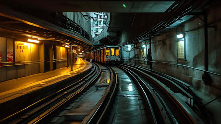 A wide shot of a subway tunnel with long, parallel tracks stretching ahead, with faint lighting casting shadows on the tunnels curved walls and floor