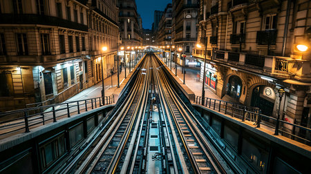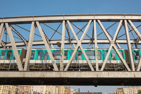 Paris Metro Underground Subway System Train Passing on Bridge Bir Hakeim Railroad in Paris, France, aeiral view