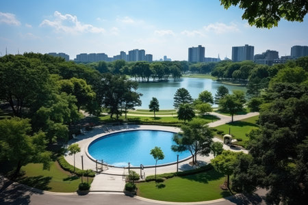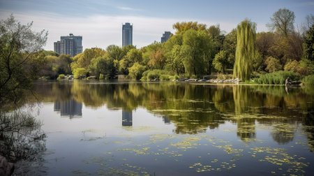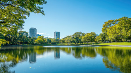 A breathtaking urban oasis captured on a bright, sunny day. This image showcases a tranquil pond reflecting the surrounding architecture and lush green trees. The peaceful water mirrors the city skyline, creating a serene and scenic environment. Ideal for projects emphasizing urban landscapes, nature integration, or a sense of calm and beauty, this photo is perfect for travel blogs, environmental publications, or architectural visualizations. The daylight highlights the beautiful foliage and offers a sense of summer in the city.