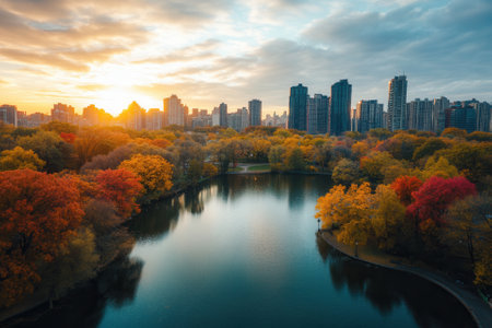 Vibrant autumn foliage surrounding a calm lake with a city skyline at sunrise.