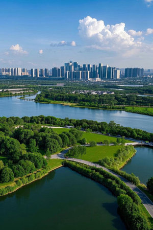 Experience the mesmerizing beauty of a cityscape harmoniously intertwined with a serene lake, as seen from above, A city of skyscrapers juxtaposed with verdant city parks, AI Generated