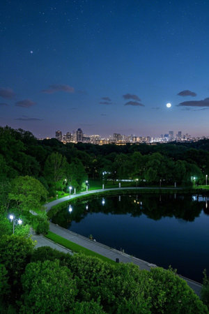 Panoramic view of the lake at night in the city park