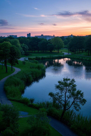 Sunset over city park with lake and walking paths.