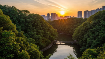 An overhead perspective captures a river flowing through a forested valley. The scene is illuminated by the warm glow of the setting sun, casting long shadows. Dense green trees border the water, with an urban skyline visible in the distance. This image could be used in various commercial or editorial contexts.