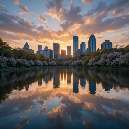 A calm pond reflects the city skyline in a park on a sunny day