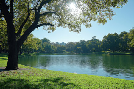 A serene park scene featuring a calm pond, surrounded by lush trees under a clear blue sky, providing a perfect getaway for relaxation and nature appreciation.